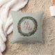 Esta almofada festiva de Natal "Sr. & Sra." com tema de casamento country apresenta ilustrações ocidentais desenhadas à mão de uma coroa de pinheiro com botas de cowboy, chapéu de cowboy, frutos de azevinho, cactos e ornamentos natalinos vintage em tinta preta contra um elegante fundo verde-sage. Personalize com o inicial e nome da sua família para torná-lo exclusivamente seu.