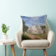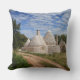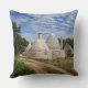 Coxim do travesseiro decorativo da foto com uma imagem da pedra branca, casas tradicionais cónicas do trulli com uma entrada de automóveis e um jardim com oliveiras sob um céu agradável em um recurso de férias perto de Alberolbello em Puglia/Apulia em Italia do sul.