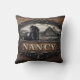 Um cartaz de madeira apresenta um intricadamente esculpido cavalo preto e celeiro, mostrando o nome de Nancy de forma destacada.
