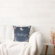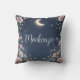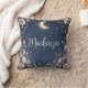 This custom throw pillow features a celestial floral garden theme. A border of pretty little flowers frames the pillow, with a glowing crescent moon placed near the top. The background is a dark blue color, resembling the night sky over an enchanted garden. A sample name is printed in the center which you can personalize to include your own custom name or other text.