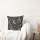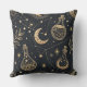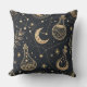 A mystical celestial witchcraft seamless pattern throw pillow featuring elegant gold line art of potion bottles, crescent moons, stars, and constellations against a deep black background. The design blends magical alchemy with cosmic elegance, creating a luxurious and enchanting atmosphere. Perfect for witchy aesthetics, celestial art lovers, or anyone drawn to astrology and the mysteries of the night sky.