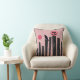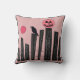 A cena do Dia das Bruxas com cerca, corvo, lua de cheio, e abóbora em um travesseiro decorativo de fundo rosa divertido.