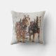 Um travesseiro com uma fotografia à porta fechada com uma equipe de 2 cavalos belgianos a puxar um trenó. Flocos de neve suavemente caindo com pinheiros cobertos de neve no fundo.