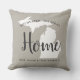 O travesseiro de boas-vindas apresenta um design de tipografia com texto de script "Home" e mapa do estado de Michigan. Personalize com seu monograma de cidade e família. Cinzas quentes, preto macio e branco. Um padrão de listras horizontais veste a parte de trás do travesseiro.