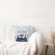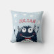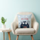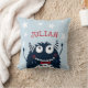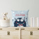 O legal travesseiro decorativo personalizado do quarto do seu monstro mostra seu nome em letras vermelhas vibrantes em um fundo azul-céu decorado com estrelas brancas e um monstro sorridente vestindo uma gravata de arco.