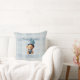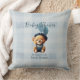Crie um travesseiro decorativo chá de fraldas único com cores azuis, e um ursinho cônico casual com gingham e balões. A frente inclui o nome do evento e o convidado de honra que você pode editar para suas necessidades. Urso Jean Baby design. Use a modelo para criar um travesseiro decorativo especial e personalizado para seu chá de fraldas. Também, faça um belo presente.