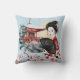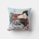 Uma linda garota gueixa segurando um fã fica em frente a um templo pagoda vermelho neste travesseiro decorativo. Ela está vestida de vermelho e preto, com um fundo de ouro e azul pálido. No fundo estão os galhos cor-de-rosa. Bonito! Ambos os lados do travesseiro têm a mesma imagem.