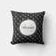 Um travesseiro decorativo quadrado de monograma com um padrão de círculos preto e branco com corações clássicos. Personalize adicionando seu nome e monograma inicial à estrutura girada em círculo. Parte da Coleção de Cores de Verão do Decor de Sala Negra.
