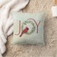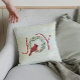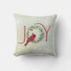 Christmas pillow featuring a red cardinal resting within a festive wreath taking the place of the "O" in JOY.