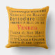 Marcas de terra de Veneza na tipografia vintage, texto preto em laranja com sotaque vermelho. Na parte de trás do travesseiro, uma dramática imagem vintage de uma máscara veneziana tradicional, vermelha em laranja. Traga Venezia para sua casa!