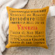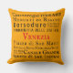 Marcas de terra de Veneza na tipografia vintage, texto preto em laranja com sotaque vermelho. No verso do travesseiro, uma dramática imagem de uma máscara veneziana tradicional, vermelha em laranja. Traga Venezia para sua casa!