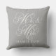 Travesseiro de sotaque quadrado elegante para casais felizes e recém-casados apresenta um roteiro branco, Sr. e Sra. design, com um texto monográfico personalizado que pode ser personalizado com o sobrenome casado. A cor de fundo da cinza pode ser personalizada para coordenar com as cores de decoração da casa ou do quarto.