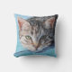 A reportagem neste travesseiro de arte é um original quadro de óleo "Cattitude" do artista prêmio Debra Mickelson. A imagem é um retrato de uma bela cinza de gato com olhos verdes amarelos. A parte traseira deste travesseiro reversível é azul de correspondência sólida.