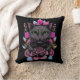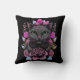 Travesseiro decorativo de sotaque divertido, com trabalho de arte de uma cinza branca e flores cor-de-rosa, contra um fundo preto. Boa ideia de presente para qualquer amante felino.