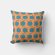 Este travesseiro decorativo tem um moderno design do século médio de círculos laranja abertos com círculos de metais sólidos correndo pelo padrão com linhas verticais lacrimogêneas e linhas horizontais laranja.