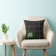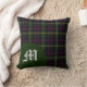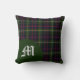 travesseiro de xadrez feito no padrão tradicional de xadrez tartan da família Malcolm colorida. Uma área circular verde, na parte inferior esquerda, tem uma cinza de luz monograma de uma letra pronto para personalizar com a sua família inicial. Travesseiro decorativo de sotaque bonito com um padrão clássico e monograma.