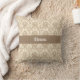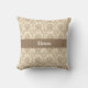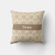 Uma bela cor damasco vintage em bege sobre um fundo pálido e brando cria um travesseiro decorativo elegante. Personalize com seu nome em uma banda bege escuro no meio.