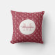 Um travesseiro decorativo quadrado de monograma clássico com um padrão de círculos vermelhos de pimenta com corações giros. Personalize adicionando seu nome e monograma inicial à estrutura de círculo moderna. Parte da Coleção de Cores de Verão de Decores de Sala de Pimenta-Chili.