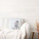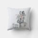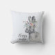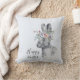 O travesseiro decorativo com o mesmo tema do Primavera bonito tem um coelho de cor da cinza com ilustração da coroa floral e texto de Felz pascoa personalizável sobre fundo azul pastel