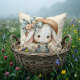 Este design caprichoso apresenta um coelho branco irresistivelmente fofo vestido com um charmoso macacão de jeans, adornado com remendos de tecido pastel e combinado com uma blusa folhada. O chapéu de palha superdimensionado do coelho, detalhado com uma fita azul sonhadora e um delicado conjunto de flores desenhadas à mão, adiciona um charme vintage cottagecore. Texturas suaves e pintadas e cores quentes e suaves aumentam a estética geral aconchegante e nostálgica, perfeita para aqueles que amam visuais doces inspirados em livros de histórias. Os olhos expressivos e o rubor suave dão a este coelho uma personalidade sincera, tornando-o uma adorável adição a temas de berçário, decoração de primavera ou presentes sazonais. Arte gerada por IA.