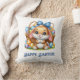 Desenho adorável de um coelho macio, castanho e branco da Páscoa, com orelhas sonolentas e um arco azul no cabelo, rodeado de ovos coloridos e decorados. Felz pascoa é escrito em tons de diversão sob a ilustração. Este travesseiro decorativo fofo também está disponível em tamanho maior.