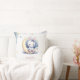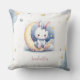 Super almofada fofa para bebês e crianças com um coelhinho branco fofo usando um lindo laço azul sentado em uma lua adorável com algumas estrelas douradas caindo e algumas nuvens azuis empoeiradas.