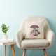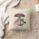 Um belo design travesseiro decorativo apresenta cogumelo rosa com flores cor-de-rosa com flores cor-de-rosa e folhas verdes exuberantes em fundo listrado vintage.