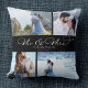 Personalize esta almofada de lançamento de caligrafia elegante moderna com o script Sr. e Sra. com o nome da sua família, 4 fotos de casamento favoritas e será um belo souvenir do melhor dia de todos! Ótimo presente para qualquer recém-casado, aniversário de casamento dos seus pais ou renovação de votos.
