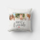 Um travesseiro decorativo moderno de colagem de fotos com melhores amigos, com a palavra bestie em uma bonito letra de script. Adicione 3 das suas fotos favoritas na frente do travesseiro. A parte traseira do travesseiro tem um padrão de bolinhas rosa e branco. Personalize-o com seu nome e seu melhor amigo. Faz um presente divertido. Projetado para você pelo Blackberry Boulevard.
