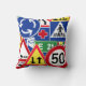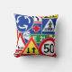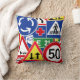 Uma colagem de sinais de trânsito europeus. Aqui está um travesseiro divertido e dinâmico para qualquer um que ama viagem na Europa, especialmente viagens de estrada.