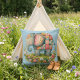 Um elefante doce e caprichoso está em meio a um prado florido, seu corpo coberto por uma colcha de retalhos coloridos que traz à vida a nostalgia aconchegante de uma cabana. Os detalhes costurados, os acentos florais e as texturas de aquarela pintadas à mão dão ao design um charme artesanal e caloroso, perfeito para aqueles que adoram ilustrações suaves no estilo de livro de histórias. Rodeado por pastéis suaves e flores de jardim, este elefante alegre irradia calor, alegria e um senso de conforto atemporal, ideal para temas inspirados em cottagecore e berçários. Arte gerada por IA.