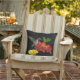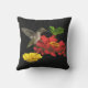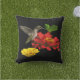 Este travesseiro exterior floral bonito apresenta um colibri rubi-throated fêmea. Paira no ar ao beber o néctar do centro dourado de uma flor vermelha brilhante do zinnia. Uma flor amarela do zinnia é próxima e algumas folhas do verde terminam a composição. Todos são ajustados em um fundo preto. A imagem é repetida na parte traseira.