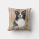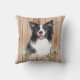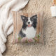 Travesseiro decorativo divertido para amantes de cães apresenta ilustração realista de pintura aquosa de collie Black and white Border Collie com spray floral bonito no fundo falso do painel de madeira.