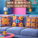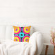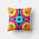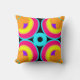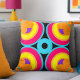 This hand‑drawn throw pillow is covered with oversized circular flower motifs in orange, pink, yellow, and purple, all arranged around a turquoise center. The bold geometric symmetry stands out against the black background, giving it a vibrant retro style. It’s perfect for making a colorful statement on your sofa, bed, or reading nook.