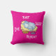 Um Travesseiro decorativo com uma ilustração de dois gatos apaixonados, dormindo em sua caixa acolchoada. Latas de comida de gato e leite nas proximidades. A ilustração é rodeada pelo texto: "Coma Repetição de Amor no Sono".