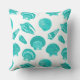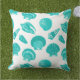 Ilustrações vintage, de aprimoramento digital, de uma variedade de conchas rendidas em um efeito craíon conte - turquesa/pavão em um travesseiro branco de fundo ao ar livre
