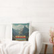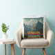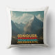 O texto "Conquistar, Comando, Comemorar." é impresso em uma fonte divertida, escrita à mão, através do centro do travesseiro. O fundo é uma ilustração colorida de uma paisagem urbana em tons de azul, verde e amarelo.