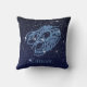 Travesseiro decorativo com o símbolo do zodíaco para Cancer em azul-prata suave, sobreposto com as estrelas da constelação, contra um fundo do céu estrelado formando de azul-da-meia-noite profundo a preto.