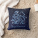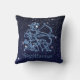 Travesseiro decorativo com o símbolo do zodíaco de Sagitário em azul-prata suave, sobreposto com as estrelas da constelação, contra um fundo do céu estrelado formando de azul-da-meia-noite para preto.