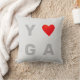 Yoga na moda moderna com coração no travesseiro decorativo de tons prateados.