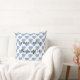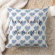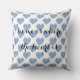 Na moda travesseiro decorativo branco com alegre design de corações azuis listrados multicolores. Texto: lar é onde o coração está em preto. Criado com um sorriso de iolantesdesigns:-)!