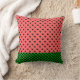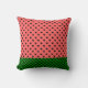 O travesseiro decorativo cerâmico perfeito para os meses de Verão apresenta um padrão de melancia cor-de-rosa e corações pretos com borda inferior de pranchas verdes escuras.