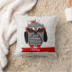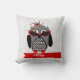 Um travesseiro que caracteriza uma ilustração de uma coruja cinzenta e preta com uma barriga do houndstooth e uns pés vermelhos. A coruja está vestindo um chapéu vermelho e preto do fascinator e uns óculos de sol vermelhos do olho de gato. Personalize com seu nome. O lado oposto é houndstooth.
