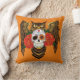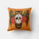 Uma coruja marrom excelente com um dia de crânio de açúcar morto e rosas vermelhas num pano de fundo de laranja.