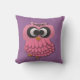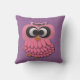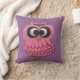 Travesseiro com uma coruja rosa e fofa sobre fundo roxo.