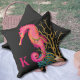 Um lindo cavalo de mar rosa nadando através de coral é a base dessa design. Há uma inicial que pode ser substituída por sua própria ou excluída, se não desejada. O padrão é repetido no verso.