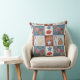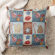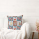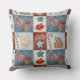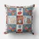 A charming watercolor patchwork pattern throw pillow featuring classic winter and holiday elements, including gingerbread cottages, knitted mittens, candy canes, star ornaments, berries, walnuts, and peppermint swirls. Each motif is placed inside soft, stitched-style square blocks in warm red, muted blue, and frosty cream tones.