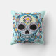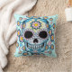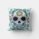 O crânio de açúcar desenhado em tons de azul e rosa é rodeado por flores e corações coloridos.