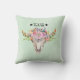 Um travesseiro hippy com um crânio de vaca tribal do sudoeste e um arranjo floral em aquarelas. As flores são uma coleção colorida que inclui cor de laranja rosa e vermelho. Texto diz Texas com duas estrelas desenhadas à mão em ambos os lados. O fundo é uma cor verde-clara.