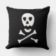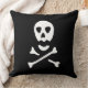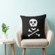 travesseiro decorativo de 20" x 20" com imagem de um crânio branco e ossos cruzados a preto. Preto para trás. Veja toda a coleção de Travesseiros de Naufrágio no DECOR| Seção Travesseiros.